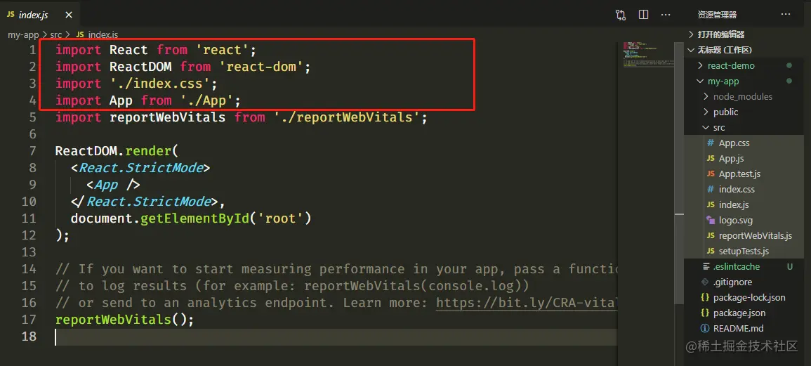 可以看到,最主要的页面index.js, 首部也是先引入react和reactDOM