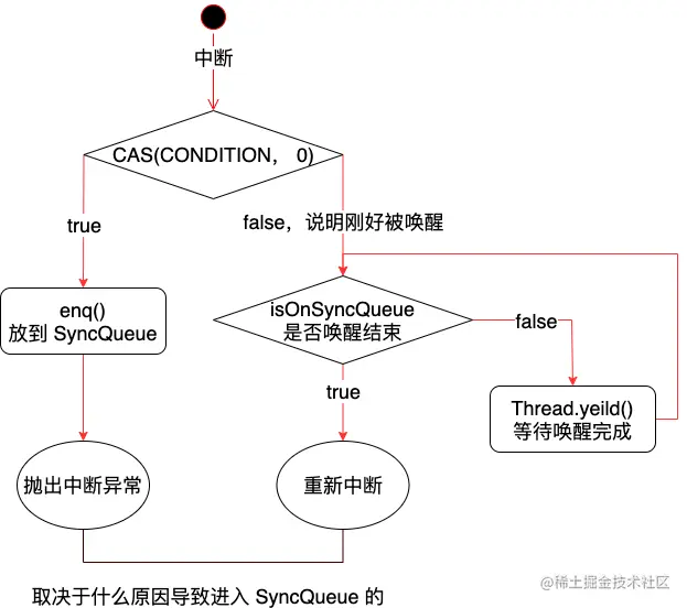 这个步骤的返回,会决定 reportInterruptAfterWait 的结果,重新中断 or 抛出异常。