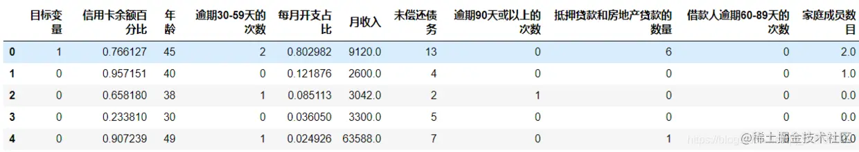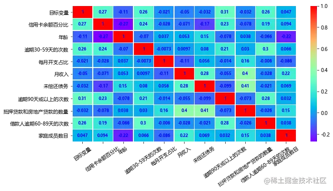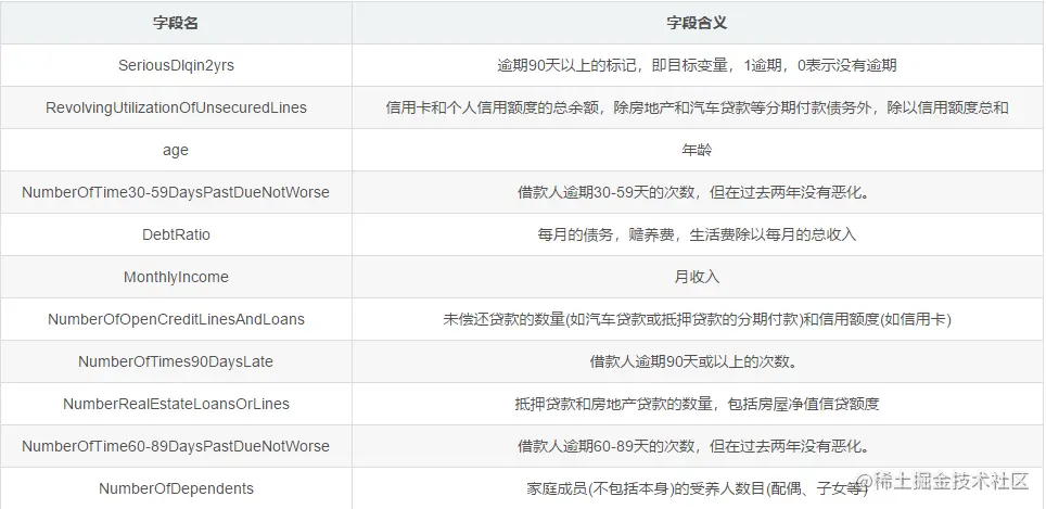 zh_label = ['目标变量','信用卡余额百分比','年龄','逾期30-59天的次数','每月开支占比','月收入','未偿还债务','抵押贷款和房地产贷款的数量','借款人逾期60-89天的次数','家庭成员数目']