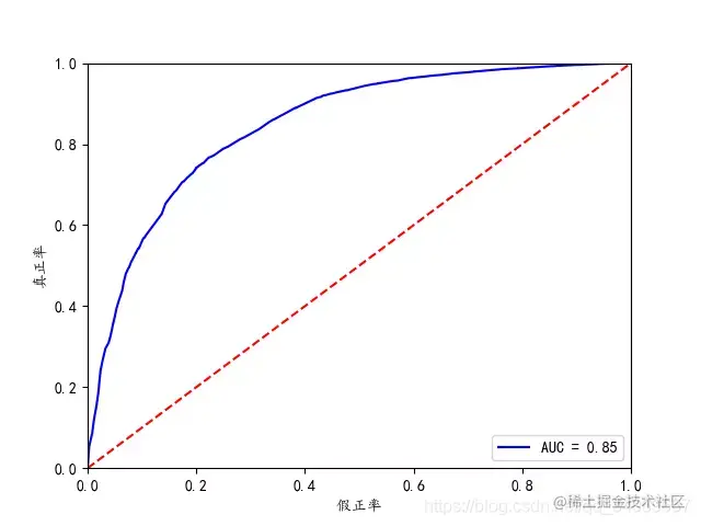 从上图可知,AUC值为0.85,说明该模型的预测效果还是不错的,正确率较高。