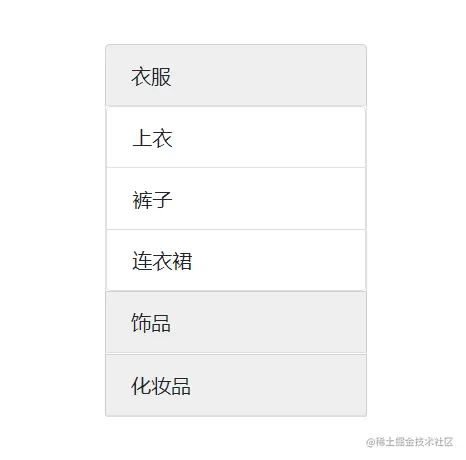 <li class="list-group-item list-bgcolor" data-toggle="collapse" data-target="#demo1">衣服</li>