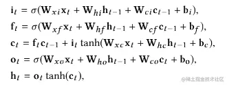 其中 分别表示输入和输出向量,其他的 分别表示输入门、遗忘门、记忆单元和输出门的激活向量。
