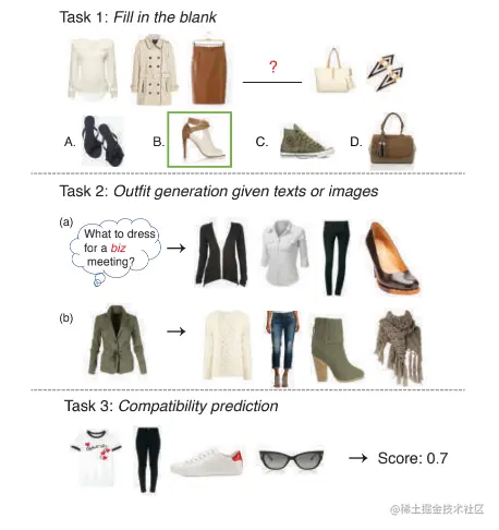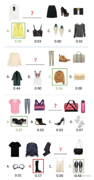 - Fill in the blank:给定一套缺失某件衣服的搭配,然后给定四个选择,让模型选择最匹配当前搭配的服饰单品;