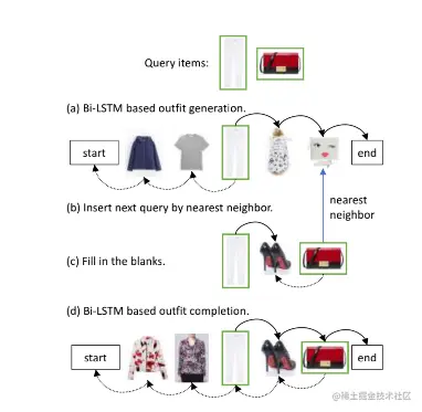 - 如果是给定多张图片,如 c 图所示,两张图片,那么会先进行一个类似 fill in the blank 的操作,先预测得到两张图片之间的衣服,然后如 d 所示,再进行预测其他位置的衣服,得到完整的搭配;