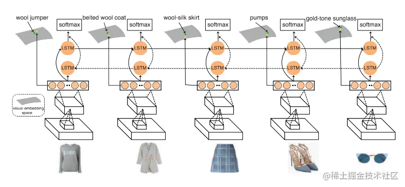 基于这个特性,本文将一套搭配看作一个序列,搭配中的每个图片就是一个独立的时间点,然后利用 LSTM 来对搭配的视觉搭配关系进行建模。
