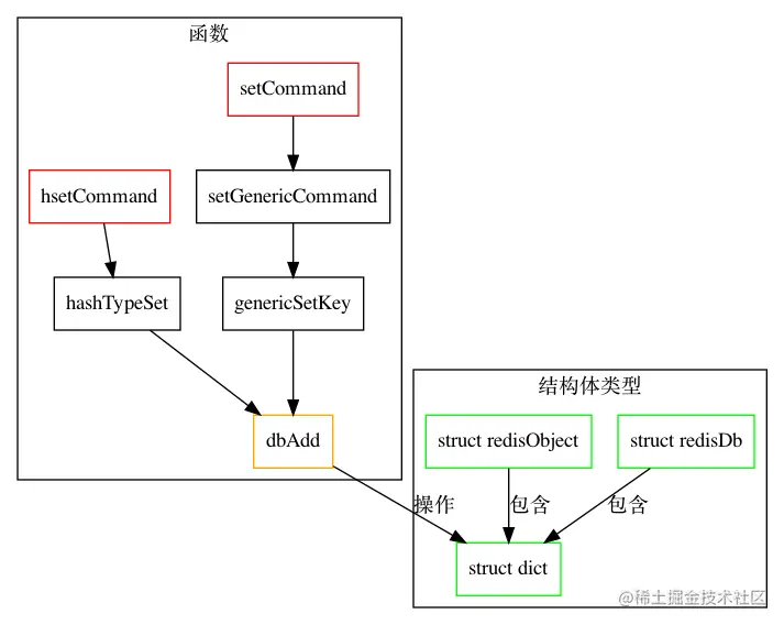 言归正传。根据键存在与否,genericSetKey会调用dbAdd或dbOverwrite。而在dbAdd中,最终调用了dictAdd将键与值存入数据库中。