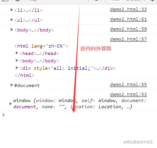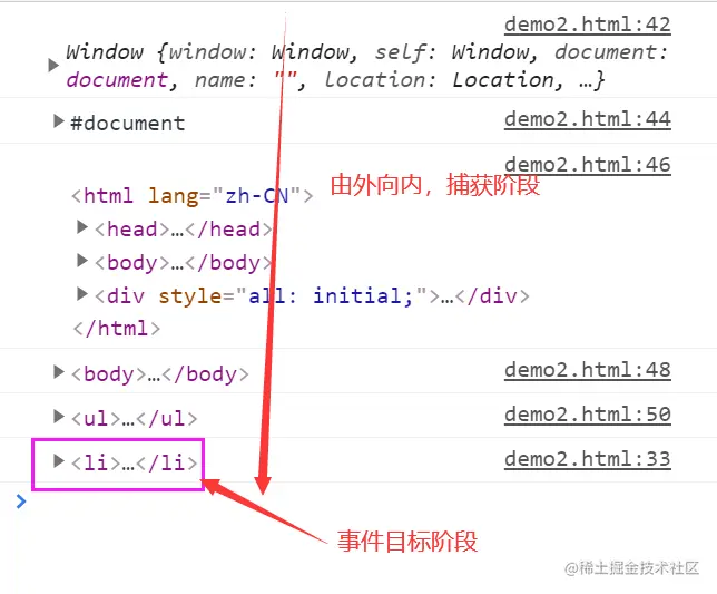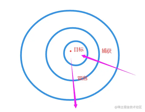 - 捕获: 从最外层元素逐级向内直到事件的绑定者