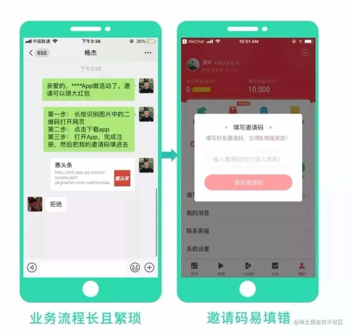 对于运营人员强关注的拉新环节,【ShareSDK】无码邀请功能,可规避拉新环节中常常遇到的注册繁琐、体验差、领取新人红包繁琐的问题,用户无需利用邀请码绑定与他人关系,点击邀请链接即可自动关系匹配,优化用户体验并且大大提高转化率。开发人员无需开发、维护关系匹配系统,接入后可大大节省开发时间成本。