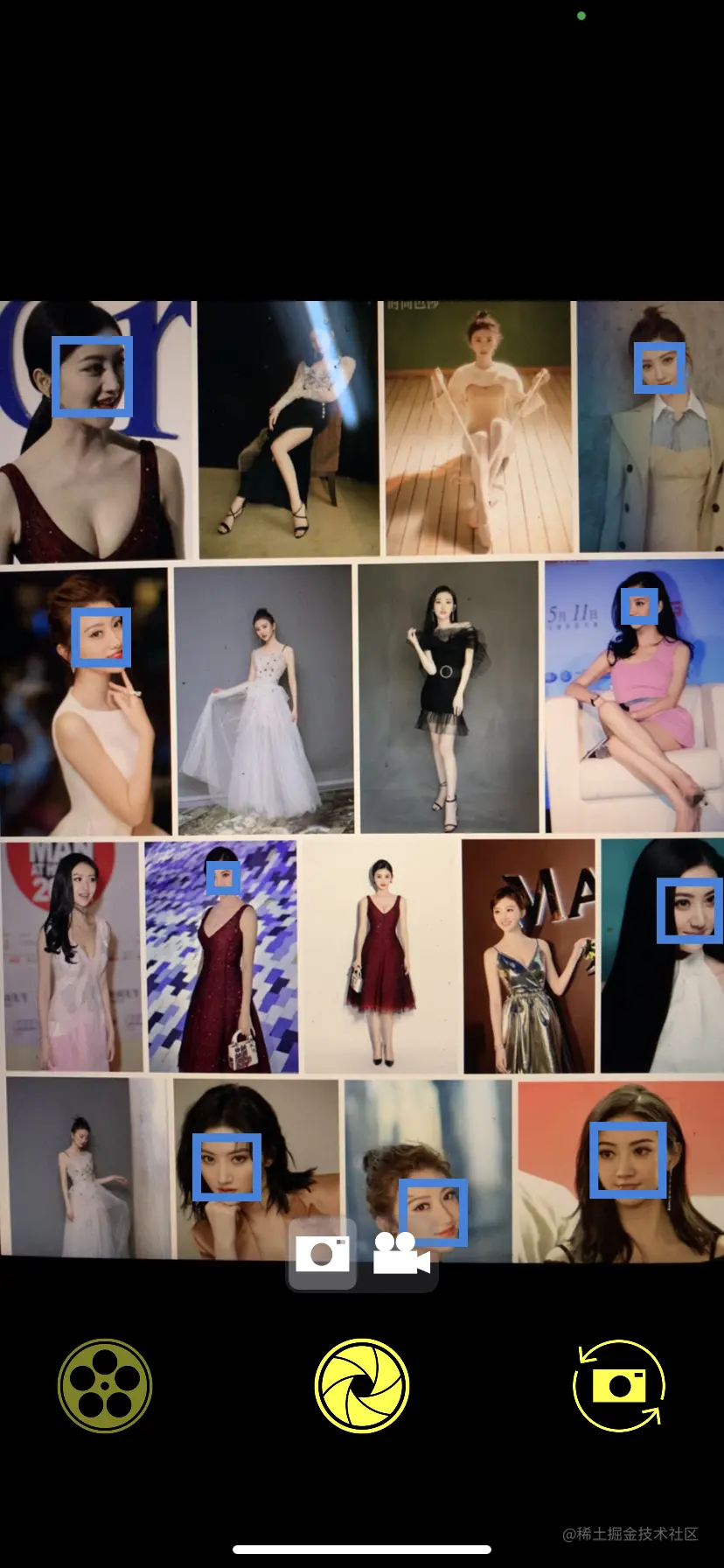 由于相机有自己的坐标系,和视图坐标系不一致,所以还需要将AVMetadataFaceObject的bounds和angle转换,如果相机的预览是使用AVVideoPreviewLayer,它提供了转换的API给开发者使用,使用方式如下: