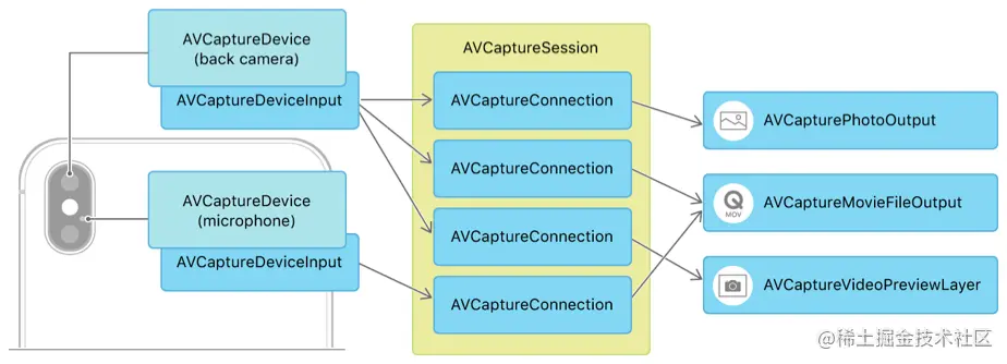 先回顾下AV Foundation的媒体捕获结构图,通过图片,可以知道相机捕获数据是通过一些列的Output输出给开发者使用的,有负责拍照的PhotoOutput、有负责视频录制的MovieFileOutput等: