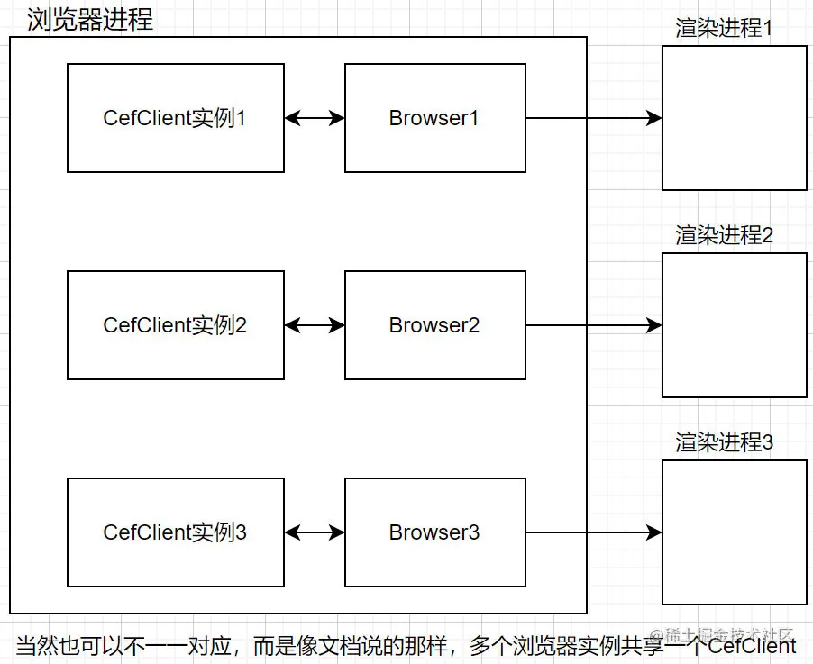 当然,文档也为我们指出,CefClient实例与浏览器实例可以不是一一对应的,多个浏览器实例可以共享一个CefClient,如此一来我们也可以总结关于CefClient的一点:非必要情况,不要编写具有状态的CefClient。