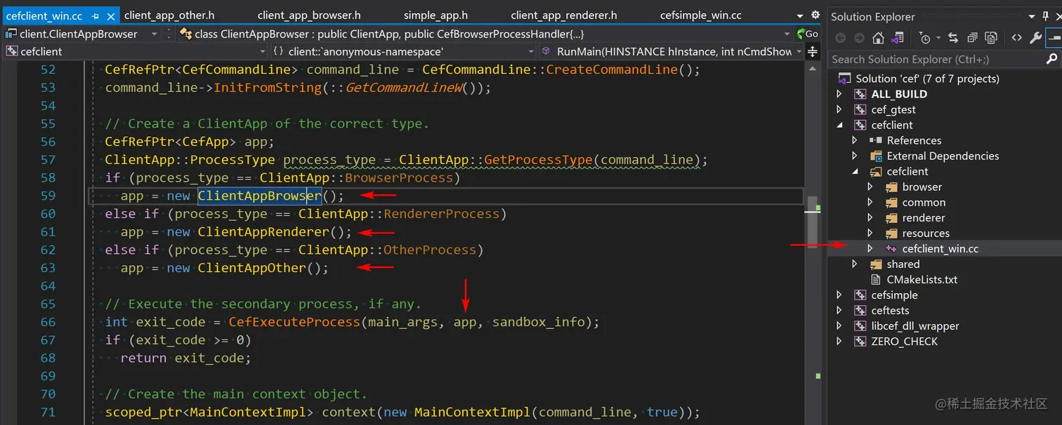 CEF应用程序会创建多个子进程(渲染render,插件plugin,GPU处理,等等)但是会共用一个可执行程序。以下的函数会检查命令行并且,如果确认是一个子进程,那么会执行相关的逻辑。