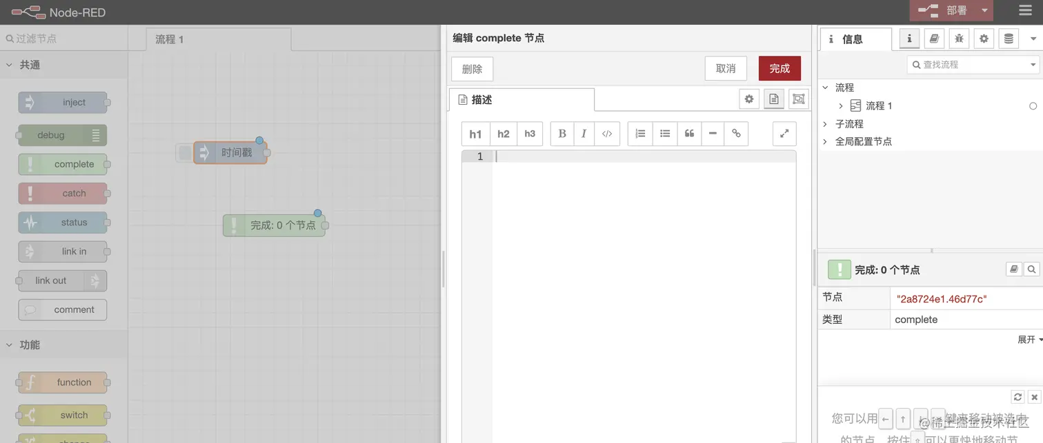 Node-RED 可以在本地安装, 并通过浏览器来访问其可视化编排界面, 其次我们还可以使用富文本编辑器在编辑器中创建JavaScript函数, 内置库还允许我们保存有用的功能,模板或流程以供重复使用。如下: