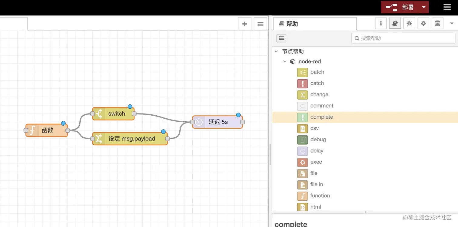 它提供了一个基于浏览器的编辑器,使得我们可以轻松地使用编辑面板中的各种节点将流连接在一起,只需单击即可将其部署到其运行时。界面如下: