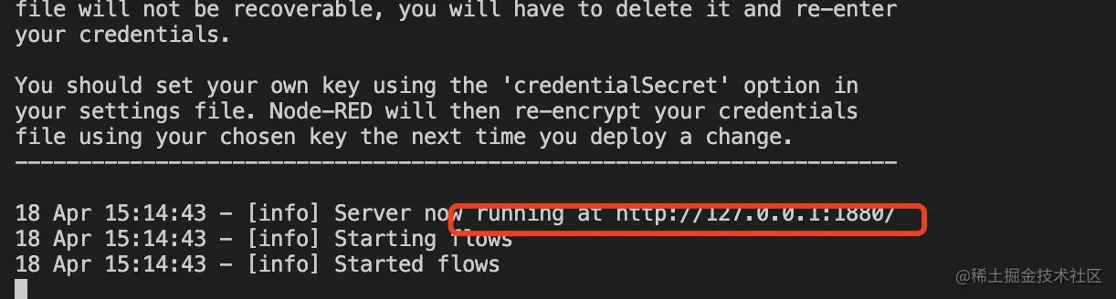 即可启动Node-RED服务, 我们在浏览器输入终端打印的如下地址即可访问使用: