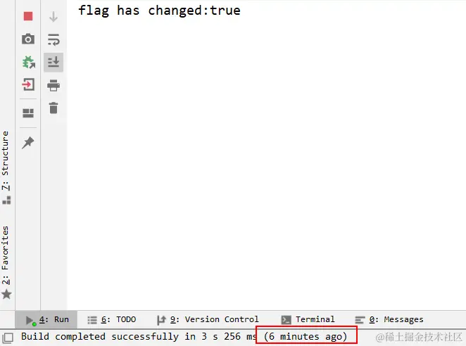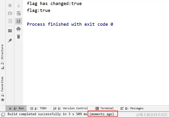 可以看到,都不到一分钟,在子线程修改flag的值后,主线程随即就退出循环,说明立刻感知到了flag变量的变化。