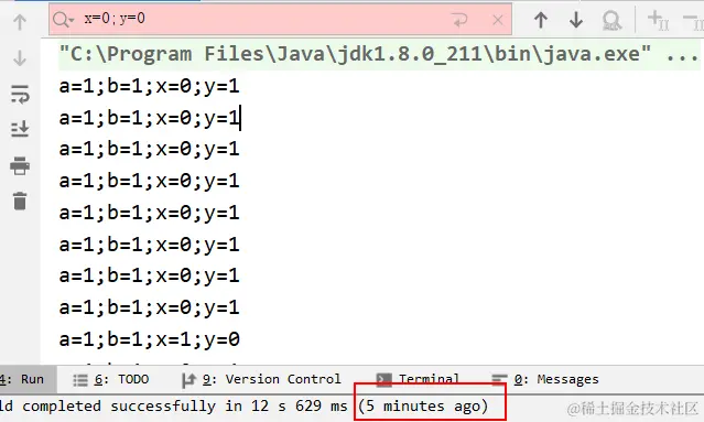 可以发现除了上面预期的三种情况,还出现了一种a = 1; b = 1; x = 0; y = 0的情况,相信大家也知道了,这种情况就是因为重排序造成的。要么是a线程重排序先执行x = b;再执行a = 1;,要么是b线程重排序先执行了y = a;再执行了b = 1;;要么是两个线程都重排序了。