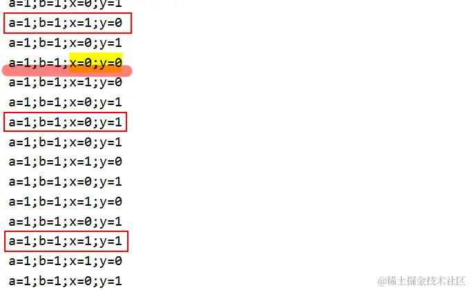 - 如果先执行完a线程(a = 1, x = b = 0),再执行完b线程(b = 1, y = a = 1),最终结果a = 1; b = 1; x = 0; y = 1