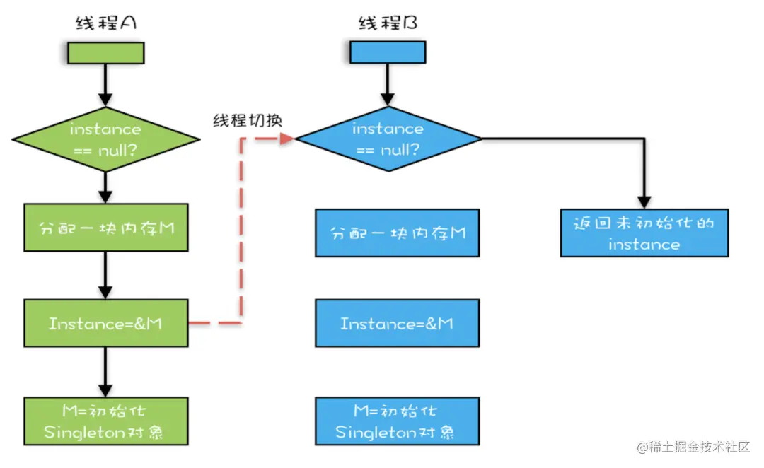 在这里第一层空判断是为了减少锁控制的粒度,使用volatile修饰是因为在jvm中new Singleton()会出现指令重排,volatile避免happens before,避免空指针的问题。从一个线程安全的单例模式可以引申出很多,volatile和synchronized的实现原理,JMM模型,MESI协议,指令重排,关于JMM模型后序会给出更详细的图解。
