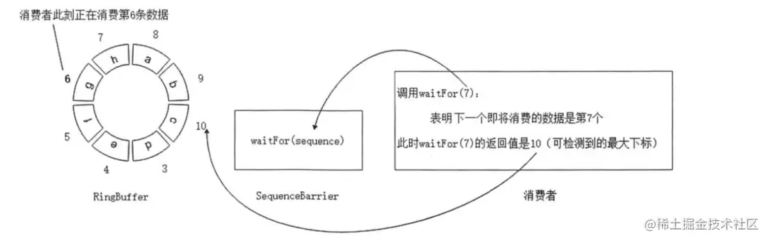 SequenceBarrier 通过waitFor方法当消费者速度大于生产者的生产速度时,消费者可通过waitFor方法给予生产者一定的缓冲时间,协调生产者和消费者的速度问题,waitFor执行时机: