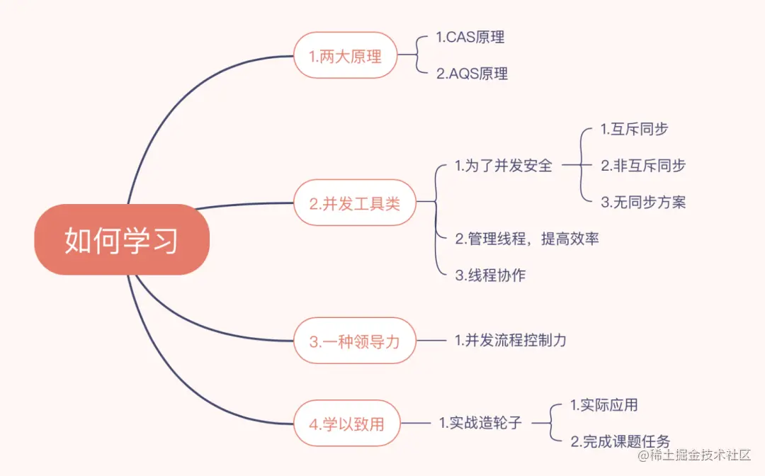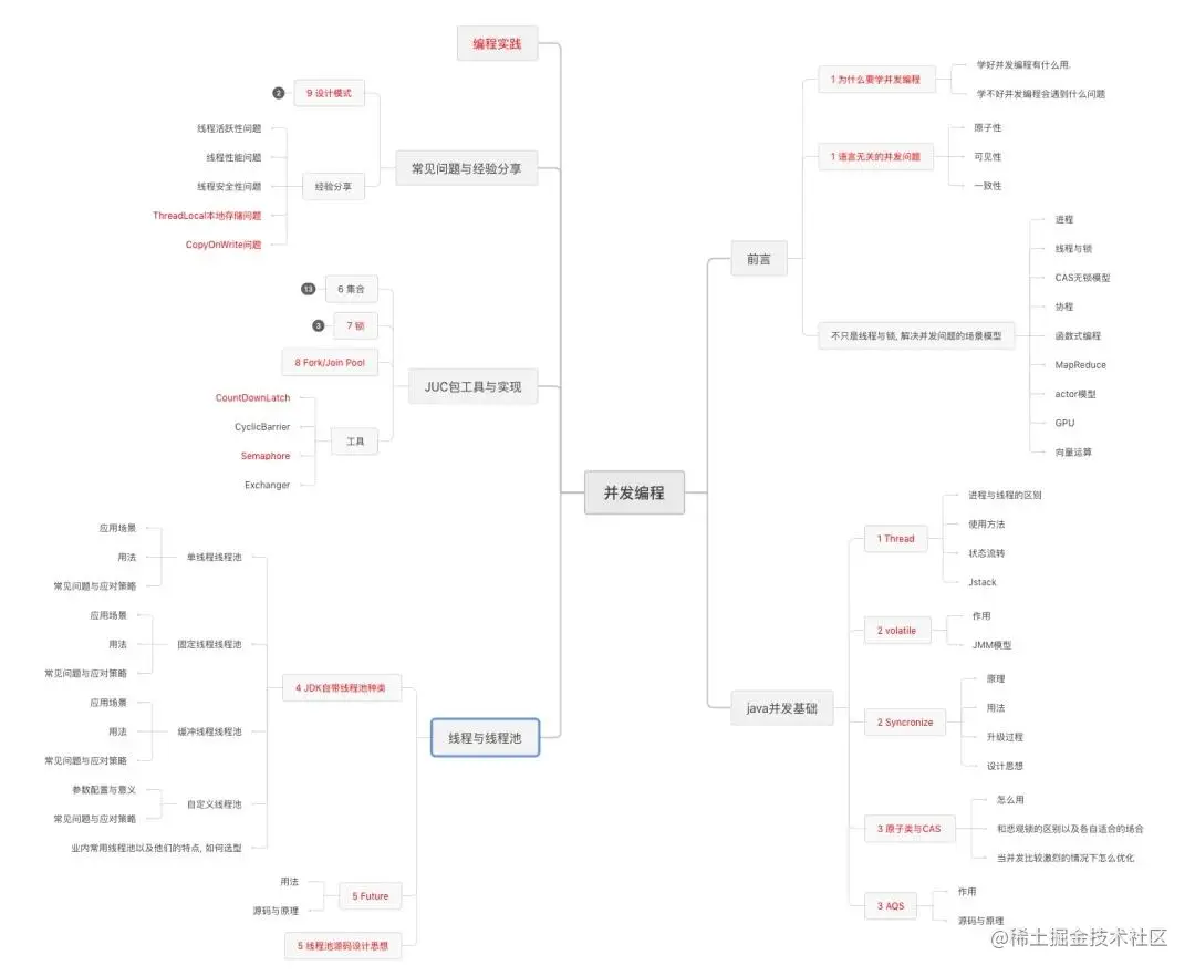 为了学习好并发编程基础,我们需要有一个上帝视角,一个宏观的概念,然后由点及深,掌握必备的知识点。我们可以从以下两张思维导图列举出来的逐步进行学习。