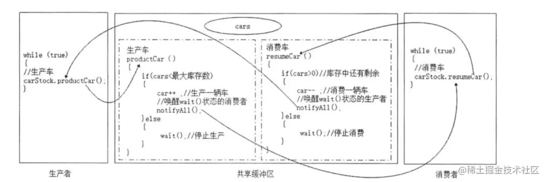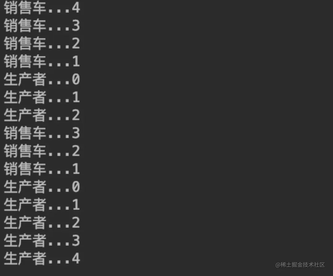 @Overridepublic void run() { while (true){ carStock.produceCar(); }}public synchronized void produceCar(){ try { if(cars < 20){ System.out.println("生产者..." + cars); Thread.sleep(100); cars++; notifyAll(); }else { wait(); } } catch (InterruptedException e) { e.printStackTrace(); }}