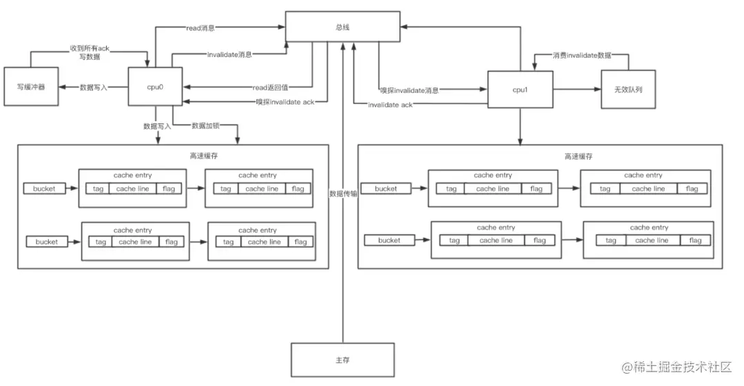 cpu0收到所有cpu返回的invalidate ack后,cpu0将flag变为E,执行数据写入,状态修改为M,类似于一个加锁过程
