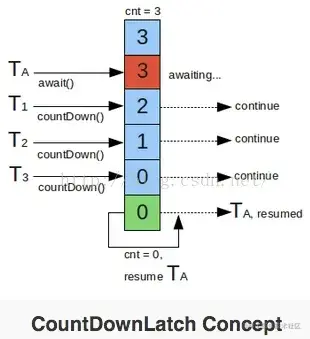 在api中当调用await时候,调用线程处于等待挂起状态,直至count变成0再继续,大致原理如下: