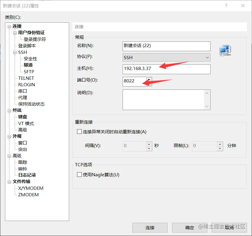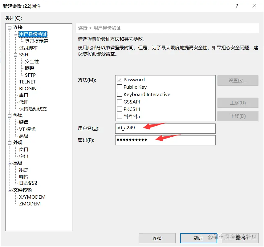 打开xshell点击新建会话,输入ip和端口,这里要注意的是手机终端的默认连接端口为8022
