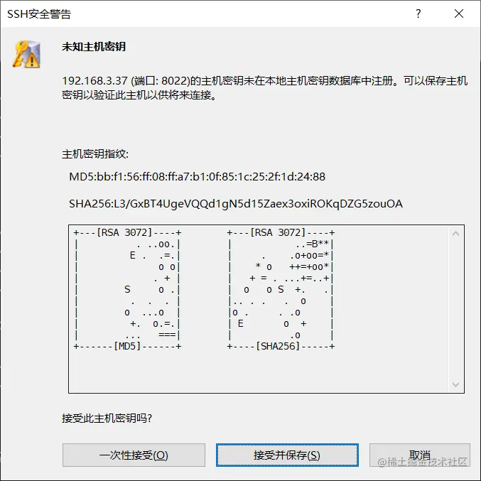 会弹出SSH安全警告,点击接受并保存。