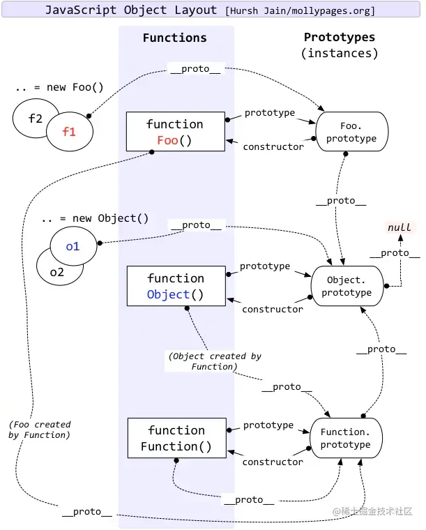 Function.prototype.__proto__ === Object.prototype这里 Function 和 Object 的联系建立了起来 —— 函数是一个对象Object.__proto__-> Function.prototypeObject 是一个函数(构造函数)Function.__proto__ === Function.prototype这里是 Function 和其他人都不一样的地方。而查找的时候,则会从Function.prototype查到Object.prototype走完原型链