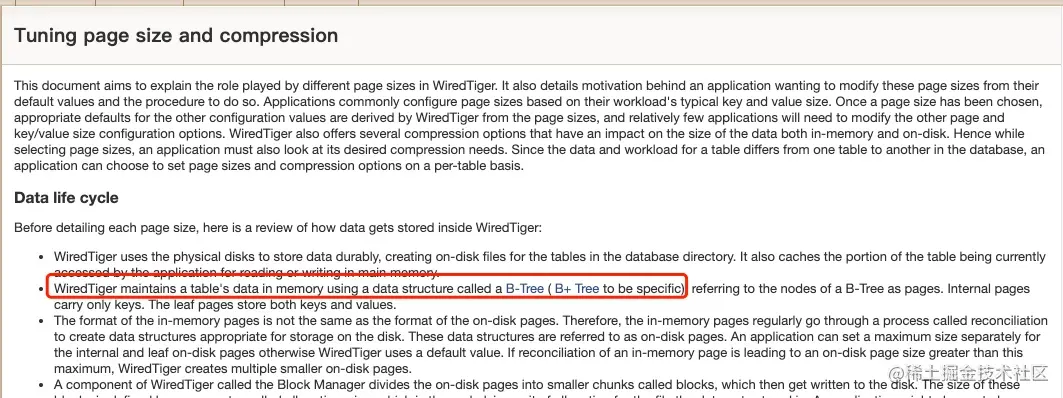 而从 WiredTiger 官网文档,我们可以知道:WiredTiger 使用的是 B+ 树作为其存储结构。