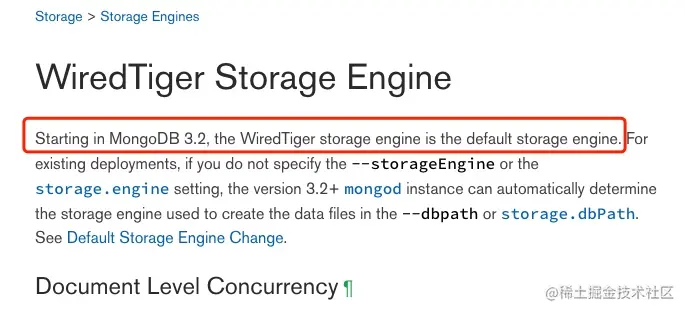 通过查阅资料,我从 MongoDb 的官网和 WiredTiger 官网找到了答案。MongoDb 官网关于存储引擎(Storage Engine)的描述写道:从 MongoDb 3.2 版本开始,其使用了 WiredTiger 作为其默认的存储引擎。