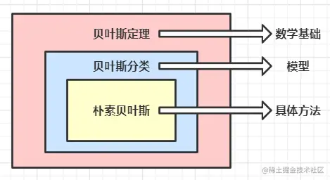在这里解释一下贝叶斯定理、贝叶斯分类和朴素贝叶斯之间的区别,贝叶斯定理作为理论基础,解决了概率论中的逆概率问题,在这个基础上人们设计出了贝叶斯分类器,而朴素贝叶斯是贝叶斯分类器中的一种,也是最简单和常用的分类器,可以使用下面的图来表示它们之间的关系: