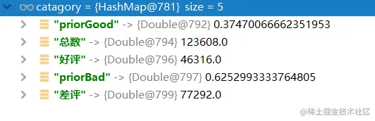 对词进行分类,统计出好评及差评的词频总数,并基于它们先计算得出先验概率: