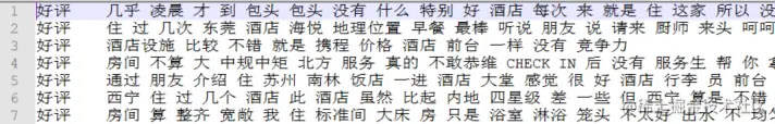 首先准备数据集,这里使用了对某酒店的评论数据,根据主观态度将其分为“好评”或“差评”这两类待分类项,对每行分词后的语句打好了情感标签,并且已经提前对完整语句完成了对分词,数据格式如下: