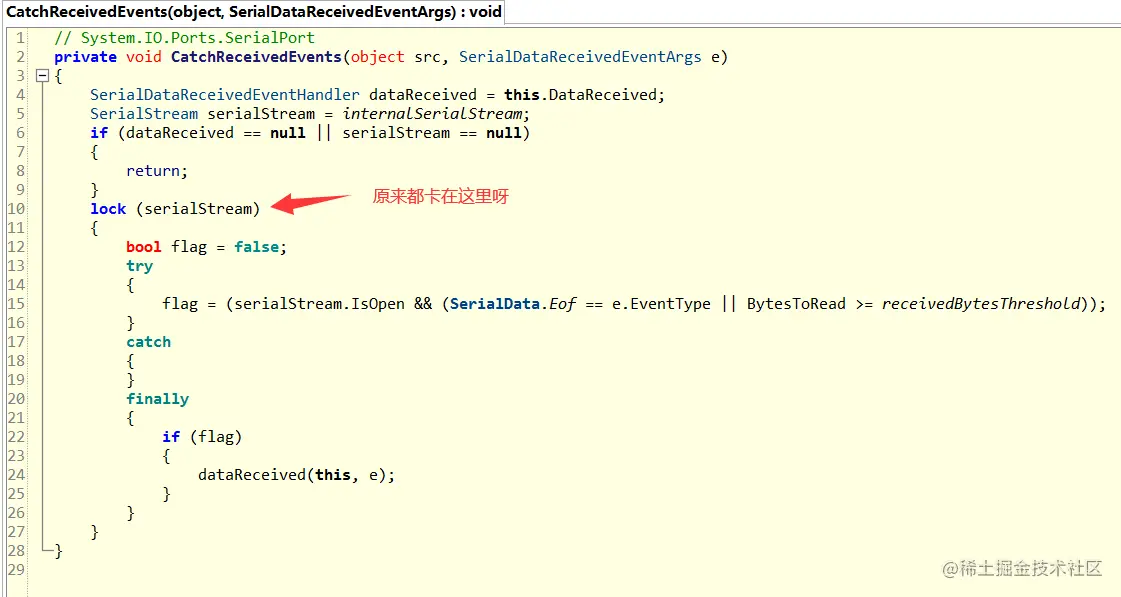 我去,居然都卡在 System.IO.Ports.SerialPort.CatchReceivedEvents 这里了,而且还是 framework 提供的,这就很困惑了。