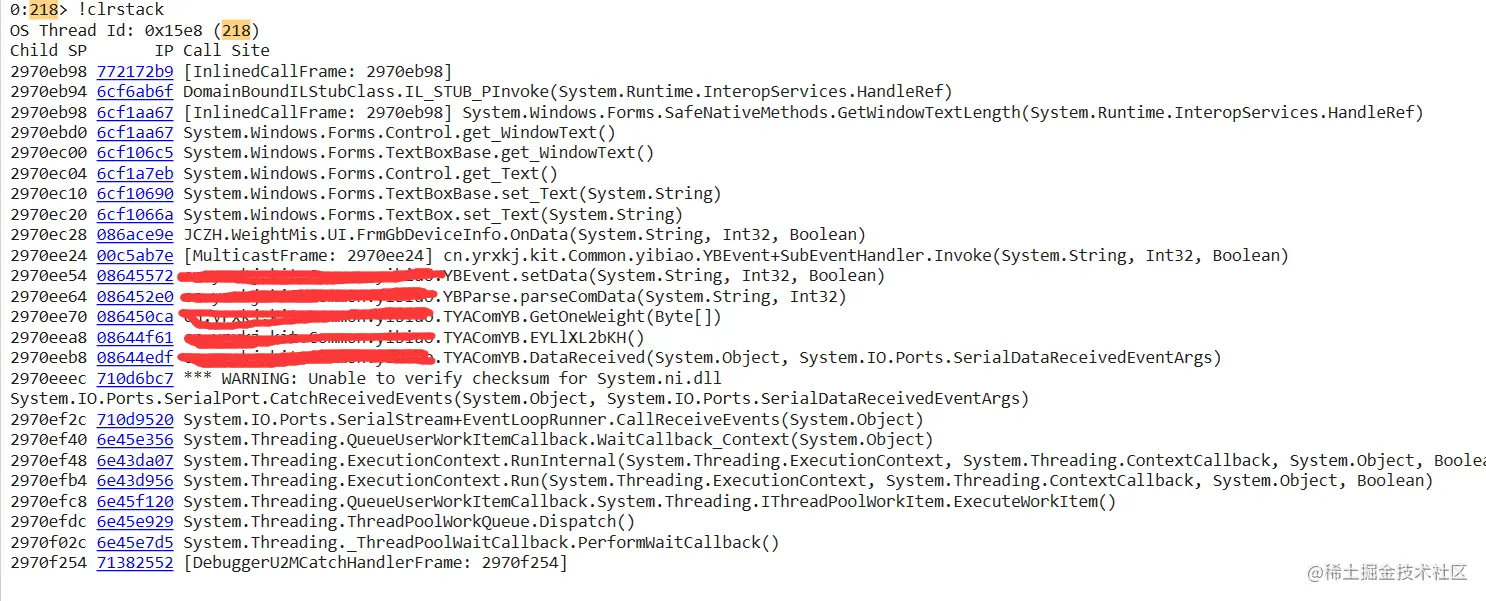 接下来看看那 33 个线程怎么就卡在 SerialStream 上呢? 可以用 ~*e !clrstack 扫一下所有的 threads,抽几个看看。