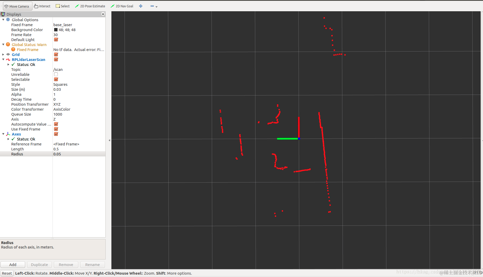 到这里我们就可以看到rviz中,rplidar的运行界面了,如下:
