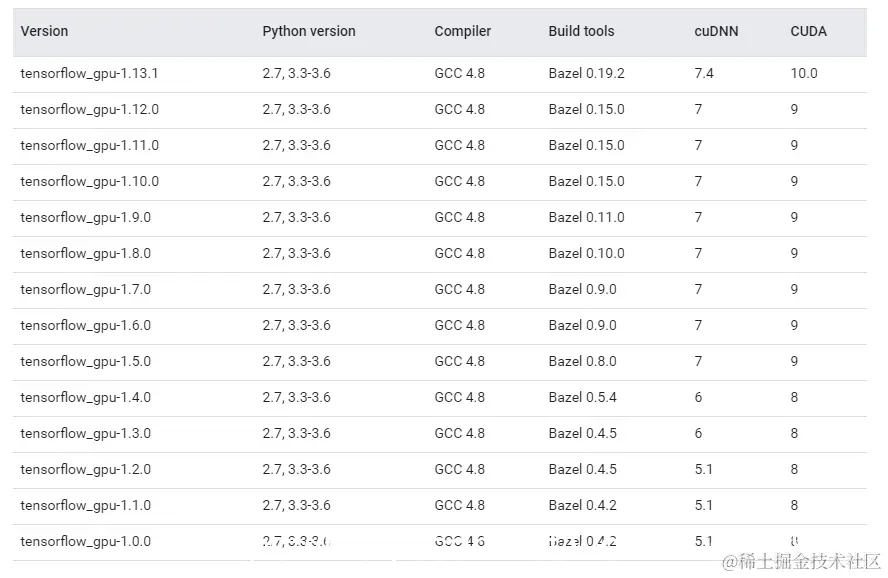 TensorFlow-GPU与Python、CUDA的版本对应问题 DylanYeung 2021-04-19 341 阅读1分钟 最近在学校的服务器上安装TensorFlow-GPU遇到了一些问题,都是一些版本对应的问题,总结了一下 以上是版本的对应 详细的可以看一下连接: tensorflow.google.cn/install/sou…