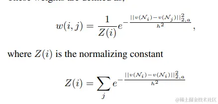 w(i,j)表示加权平均的kernel值。该值由两个块之间的相似度确定,而两个块之间的相似度则通过计算它们之间的欧式距离确定。但是,我们都知道,在一张图片中,每一个像素点,总是距离它越近的像素点与它本身的相似度越大,而距离越远,那么相似度就越小。在NLM中,算法假设权重的分布符合高斯分布