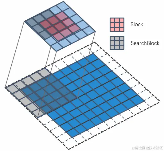 3、在SearchWindows中,以一个大小同为BXB的SearchBlock的搜索块进行滑动。