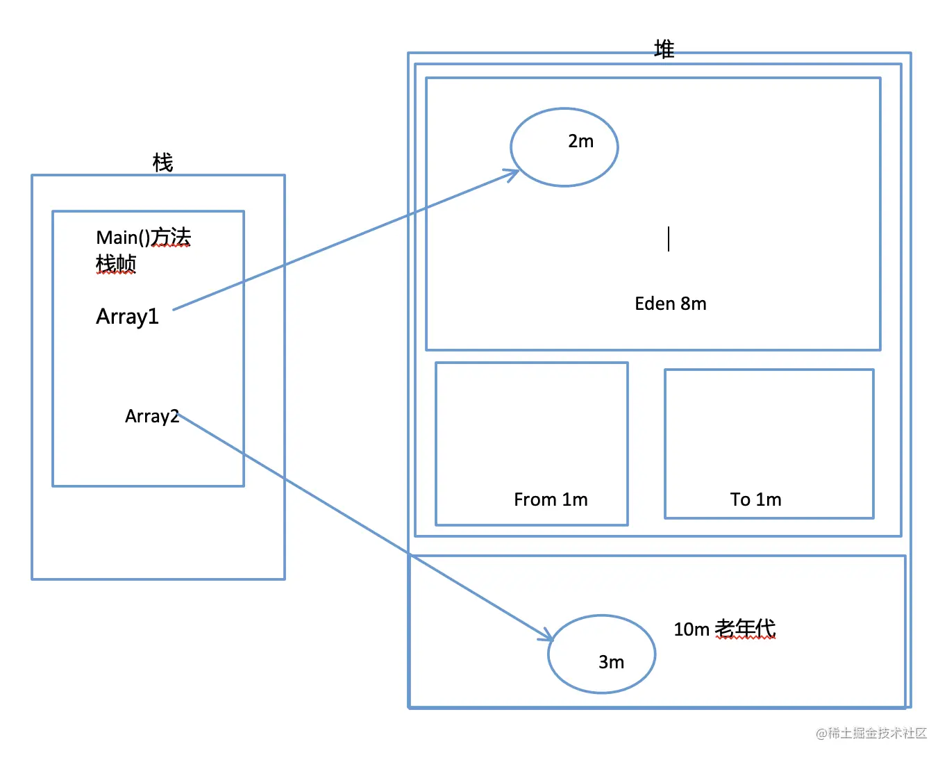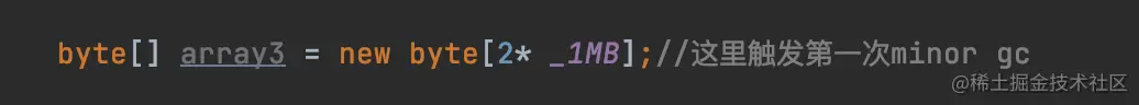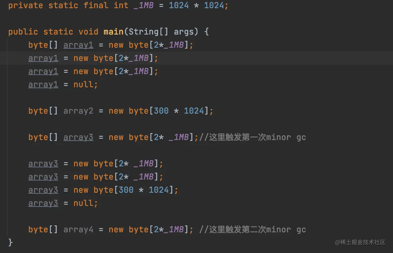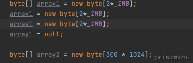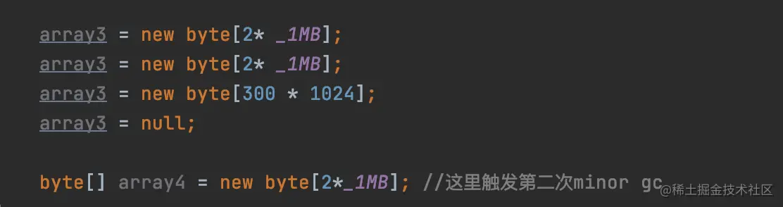 执行完这个代码。会在堆里会新增2个2m对象,1个300K对象,最后array3置为null。