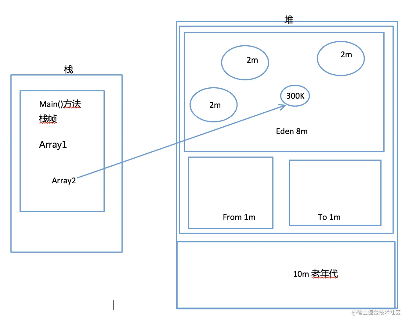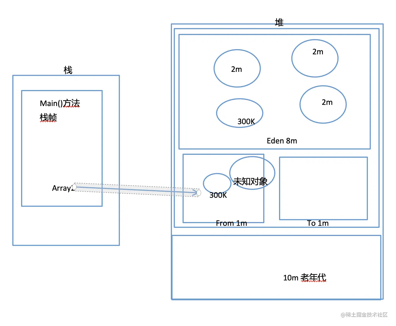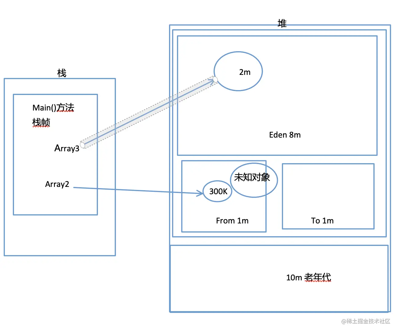 现在连续分配了3个2M的对象,和1个300K的对象,最后还把array1置为null。此时的堆图应该是这样子的