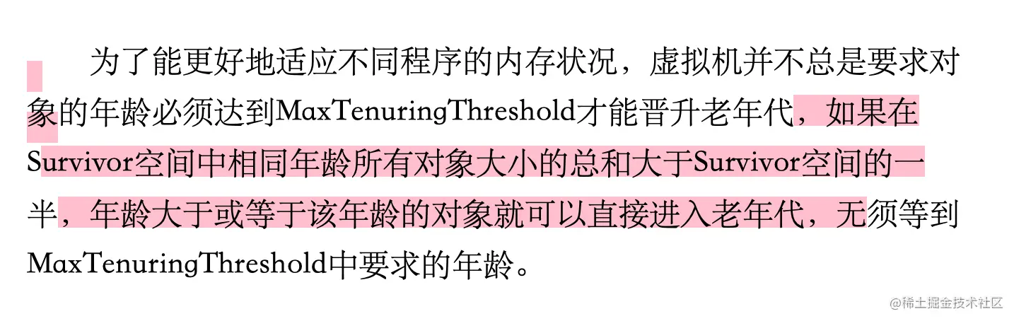 相信看过我另一篇文章JVM-动态年龄判断的小伙伴,是了解正确的说法应该是:在survivor区中,所有年龄的对象的所占空间的累加和大于survivor空间的一半,大于或等于该年龄的对象,都可以进入老年代。