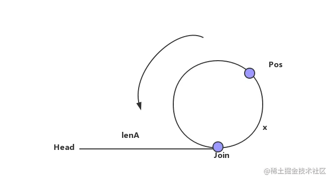 第一次碰撞点Pos到连接点Join的距离=头指针到连接点Join的距离,因此,分别从第一次碰撞点Pos、头指针head开始走,相遇的那个点就是连接点。在环上相遇后,记录第一次相遇点为Pos,连接点为Join,假设头结点到连接点的长度为LenA,连接点到第一次相遇点的长度为x,环长为R。