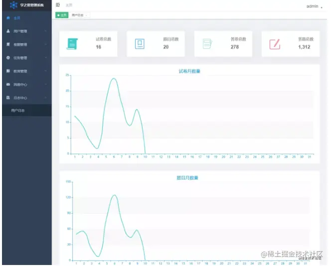 (2)主页:包含了试卷、题目、做卷数、做题数、用户活跃度的统计功能,活跃度和做题数是按月统计