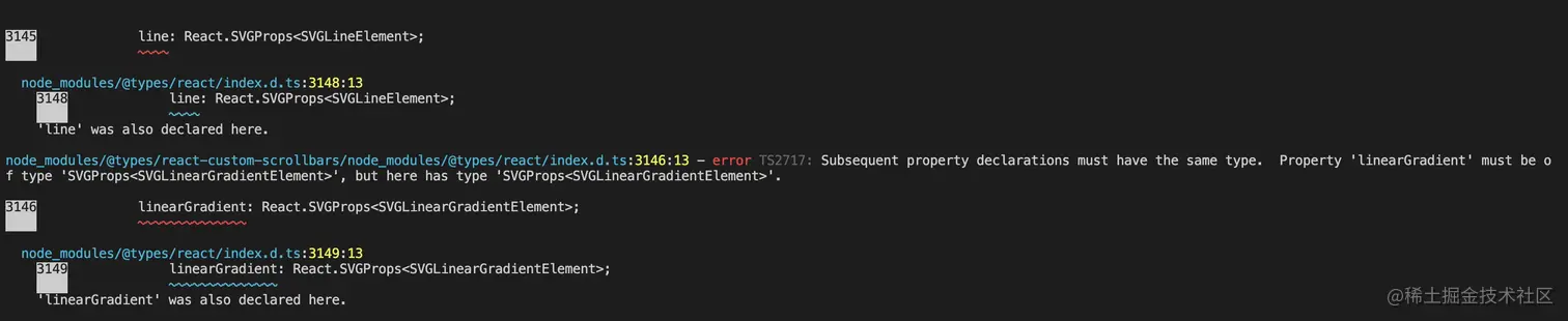 经过一通细致的检查,在 yarn.lock 中发现组件库依赖的 react 版本是 16,而 dumi 依赖的 react 版本是*,*的版本下载了 17 版本的 react,由于两个版本的 react 的 ts 类型不同,导致了类型检查不通过。