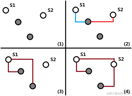 题意:如图9-(1),有两个中转点S1和S2,以及N(N <= 500)个灰色点,现在要求把灰色点和中转点连起来,每个灰色点要么连S1,要么连S2。如图9-(2),蓝色线连S1,红色线连S2,连接的距离定义为“曼哈顿距离”,两个灰色点之间的距离定义如下: