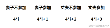 其中i的取值为[0, N),所以总的结点数为4N。我们为了方便处理,将“不参加”的结点定义为偶数编号,将“参加”的结点定义为奇数编号;并且,妻子编号模4为(0,1),丈夫编号模4为(2, 3)。每个结点可以表示成如下通项: